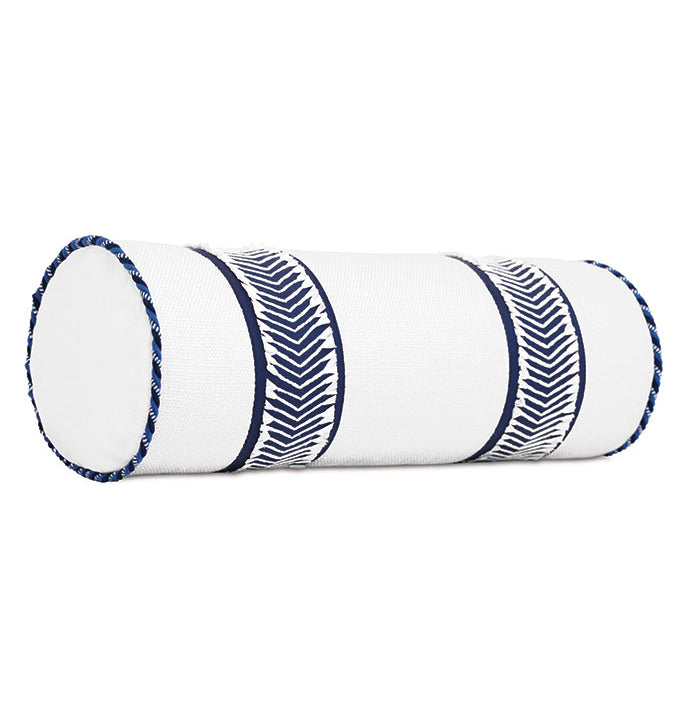 • White fabric features blue chevron border