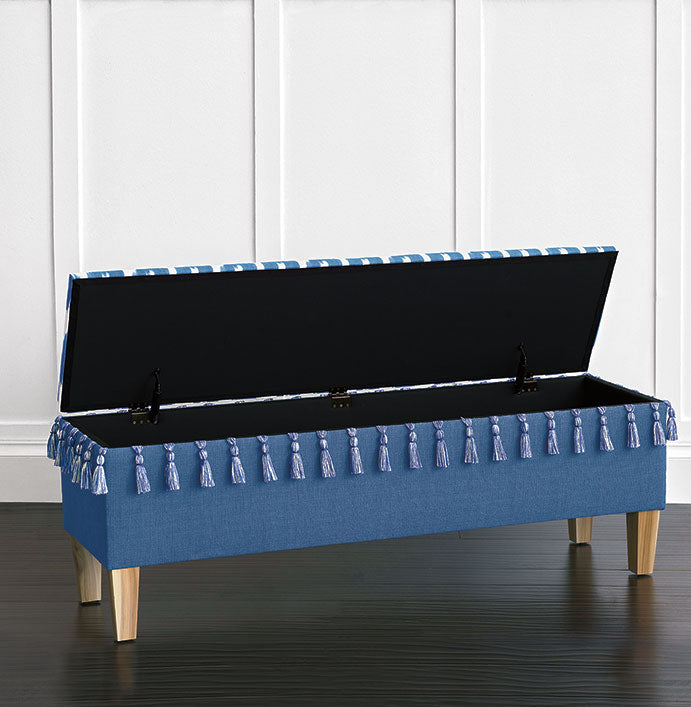 • Blue end trim with raffia chevron detailing and blue brush fringe.