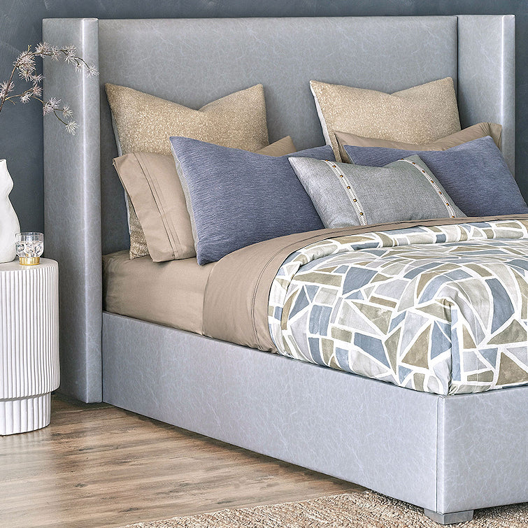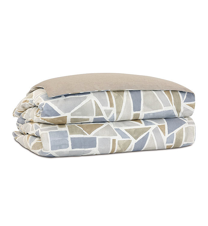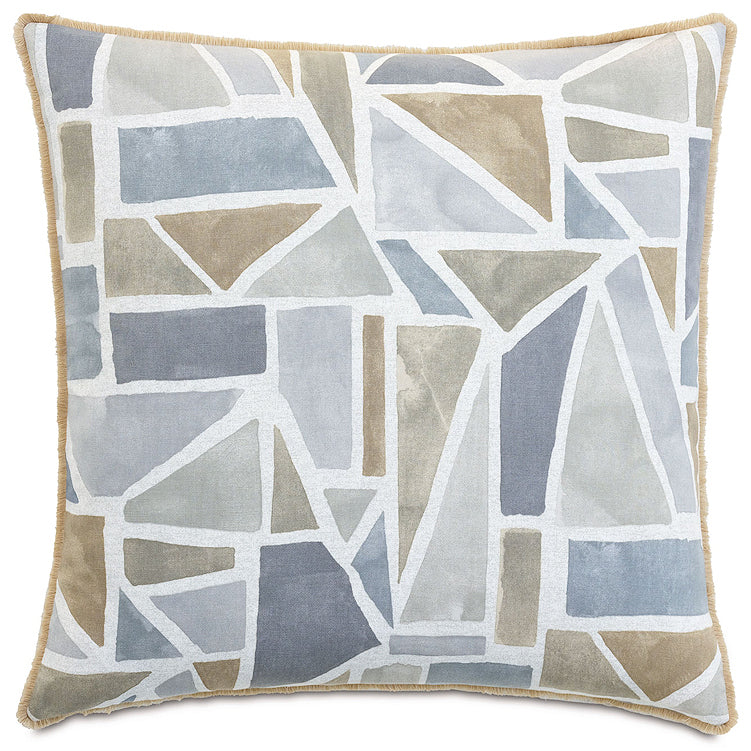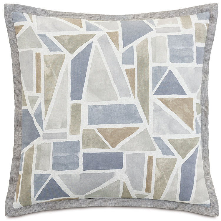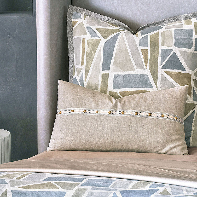Modern art meets tailored geometric form in our relaxing Lakeside Geometrics bedding. With a soothing color palette of warm neutrals and cool lake blues, its main fabric dazzles in a painterly geometric collage pattern. Textured Camel Boucle Euro shams, a button tufted bolster and slate blue chenille shams bring dimension and a welcoming, cozy feeling to this casually artful bedding.