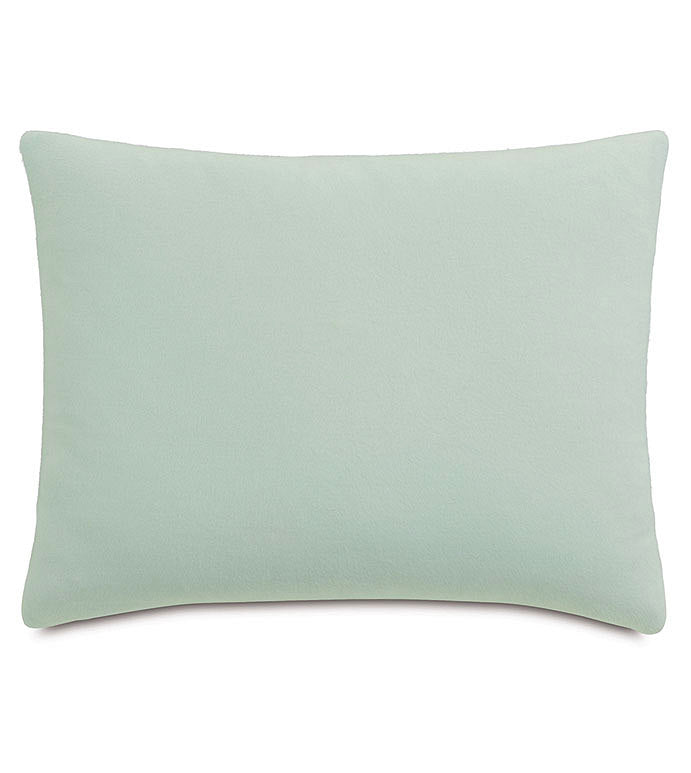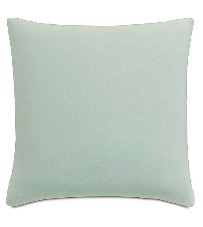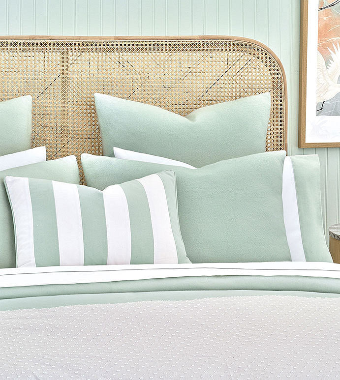 Bathe in the soothing spa colors and textures of our Serene Silk Flannel luxury bedding. Airy and ethereal, this bedding exudes style and sophistication with laidback ease. Soft spa colored silk flannel takes center stage with this bedding, supported by classic cuffed shams in white, with soft green spa cuffs. A textured dove color Fil Coupe duvet cover and spunky striped spa bolster underscore this bedding's undeniable charm.